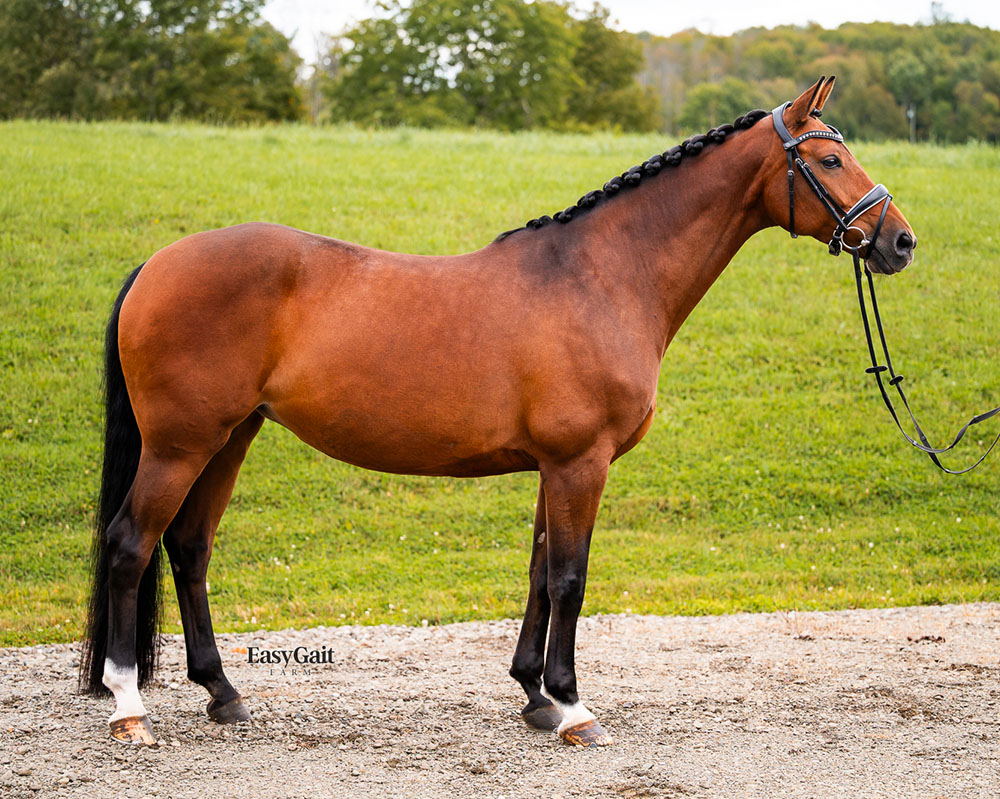 Faustine is a super athletic and high quality mare with lots of show experience through second level and many scores in the mid 70s. She has impressive, cadenced gaits with lots of expression. Faustine is straightforward to ride and has a very calm and laid back temperament. Faustine is not just a star in the dressage arena, she also enjoys trail rides alone or with other horses, is easy and sweet to handle, and excellent for trailering, vet, farrier, etc.